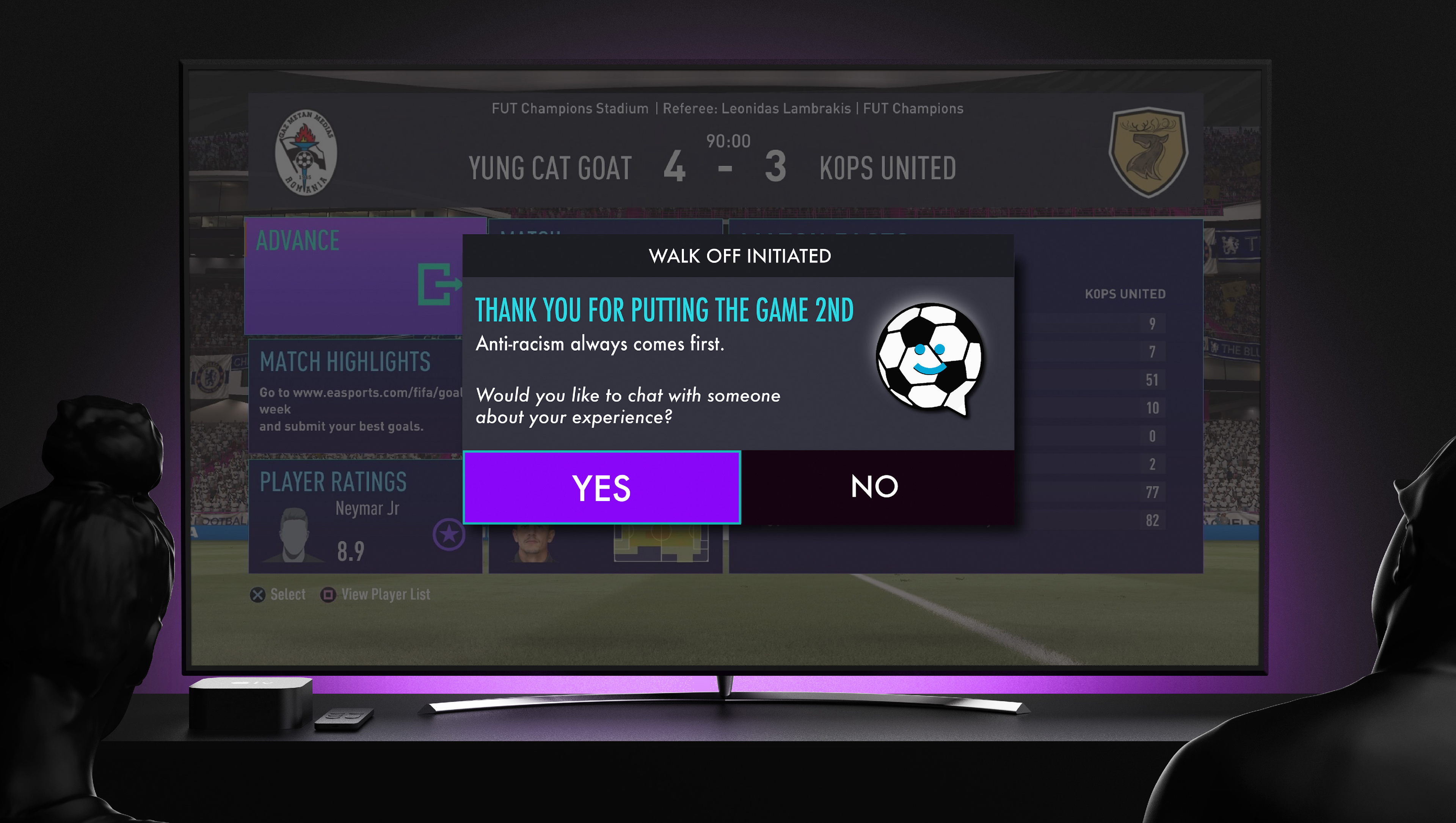 As part of #TheGameComes2nd, EA Sports launched a new feature in-game for players to "walkoff" the game in protest without facing player statistic consequences. In-game communication is analyzed and the "walkoff" feature is prompted.